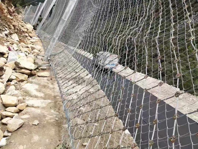被动防护网由钢丝绳网、环形网、(需拦截小块落石时附加一层铁丝格栅)、固定系统(锚杆、拉锚绳、基座和支撑绳)减压环和钢柱四个主要部分构成。钢柱和钢丝绳网连接组合构成一个整体,对所防护的区域形成面防护,从而阻止崩塌岩石土体的下坠,起到边坡防护作用。